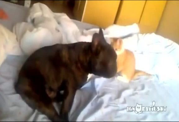 Des chiots blancs attaquent un chat